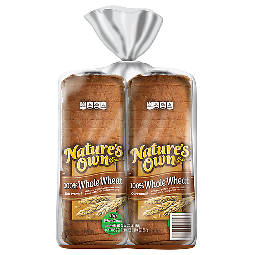 With Nature's Own® 100% Whole Wheat Bread, you don't have to compromise. 13 grams of whole grains per slice in deliciously soft sandwich bread. This bread loaf contains no artificial preservatives, colors or flavors and no high fructose corn syrup. Nature's Own 100% Whole Wheat is a low-fat food and the perfect sliced bread option for sandwich and toast recipes. Go ahead and try it toasted with homemade fruit jam for breakfast, or sandwich your favorite deli meats and cheese for a satisfying lunch or quick dinner. Pile on the goodness and bring everyone together with Nature's Own breads, buns and rolls.