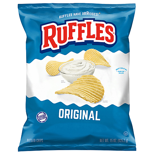RUFFLES Original Potato Chips have bold, thick and deep ridges for a tasty crunch. They're strong enough to withstand any dip. These chips are made with just three ingredients: potatoes, vegetable oil and salt. These big bags are great for sharing some delicious fun at home.