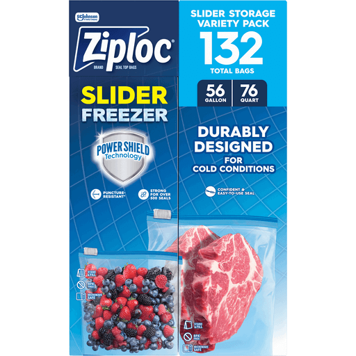 Ziploc® Brand Freezer Slider Bags, Variety Pack With Power Shield™ Technology For More Durability, 56 Gallon, 76 Quart, 132 Total